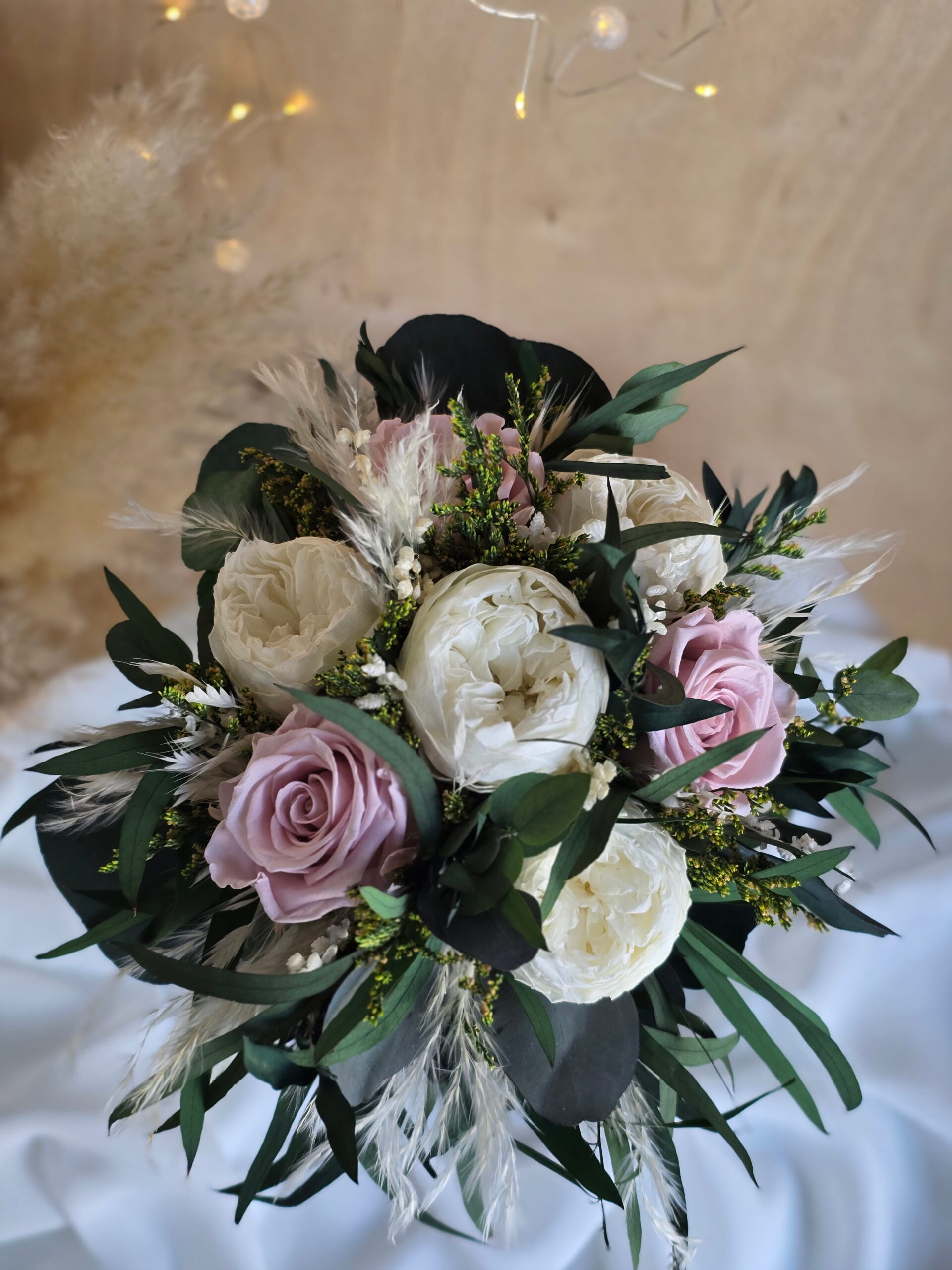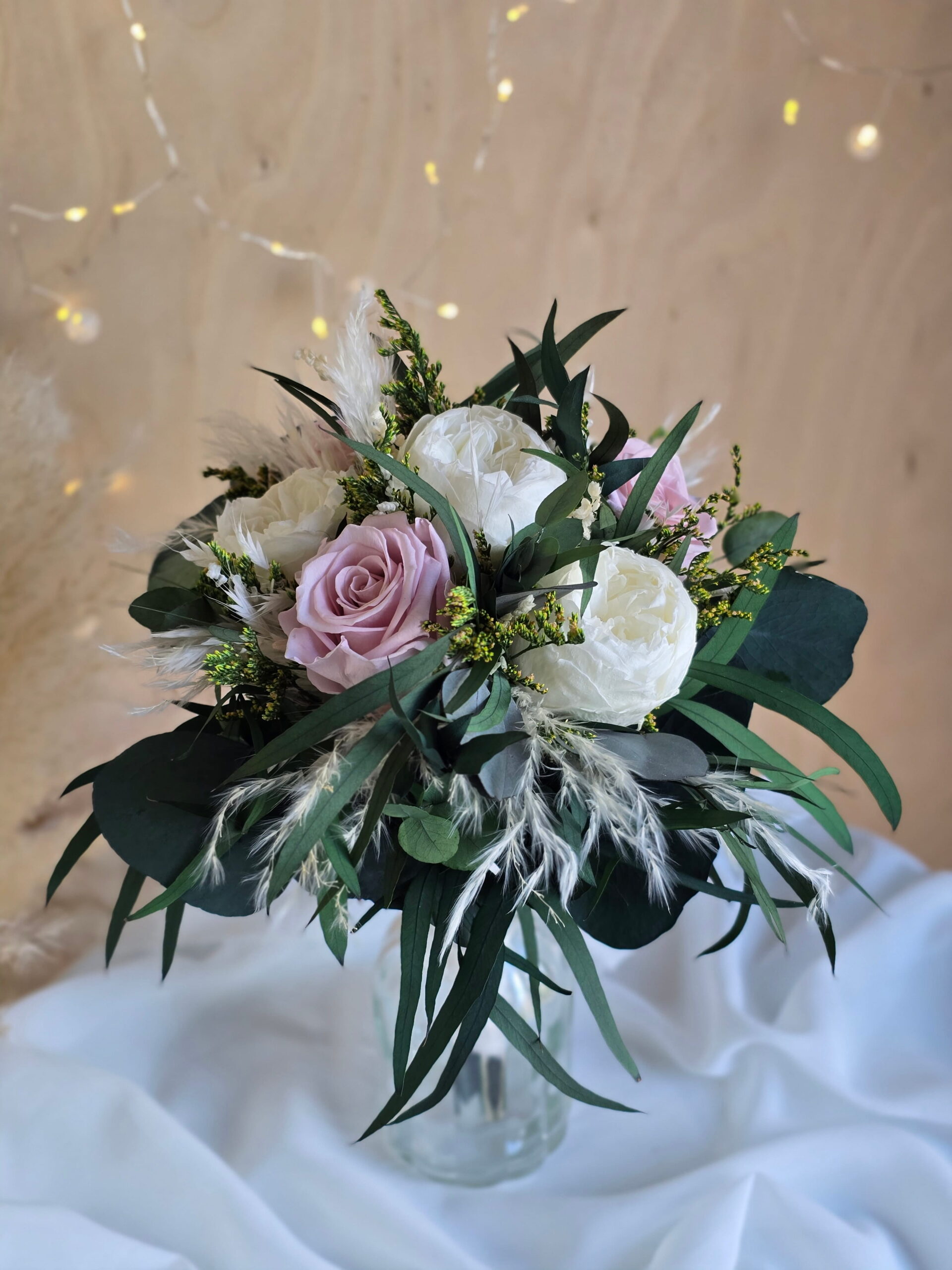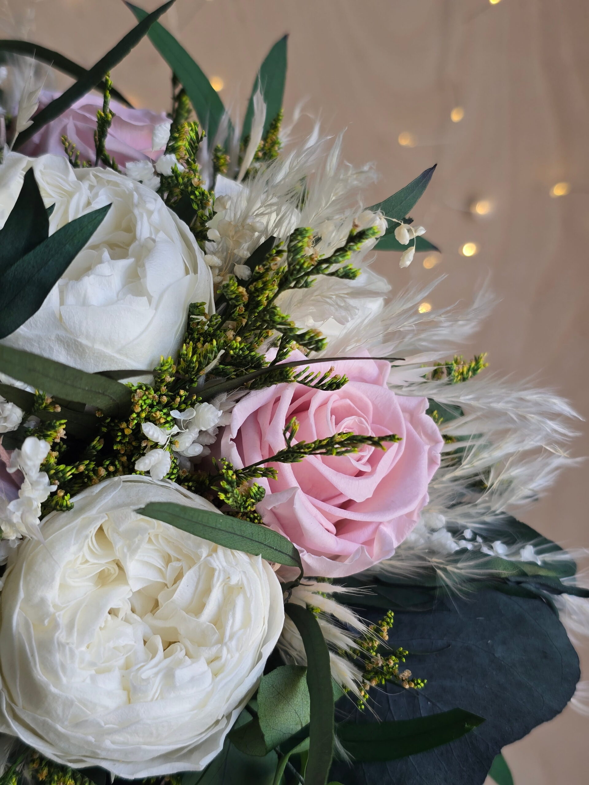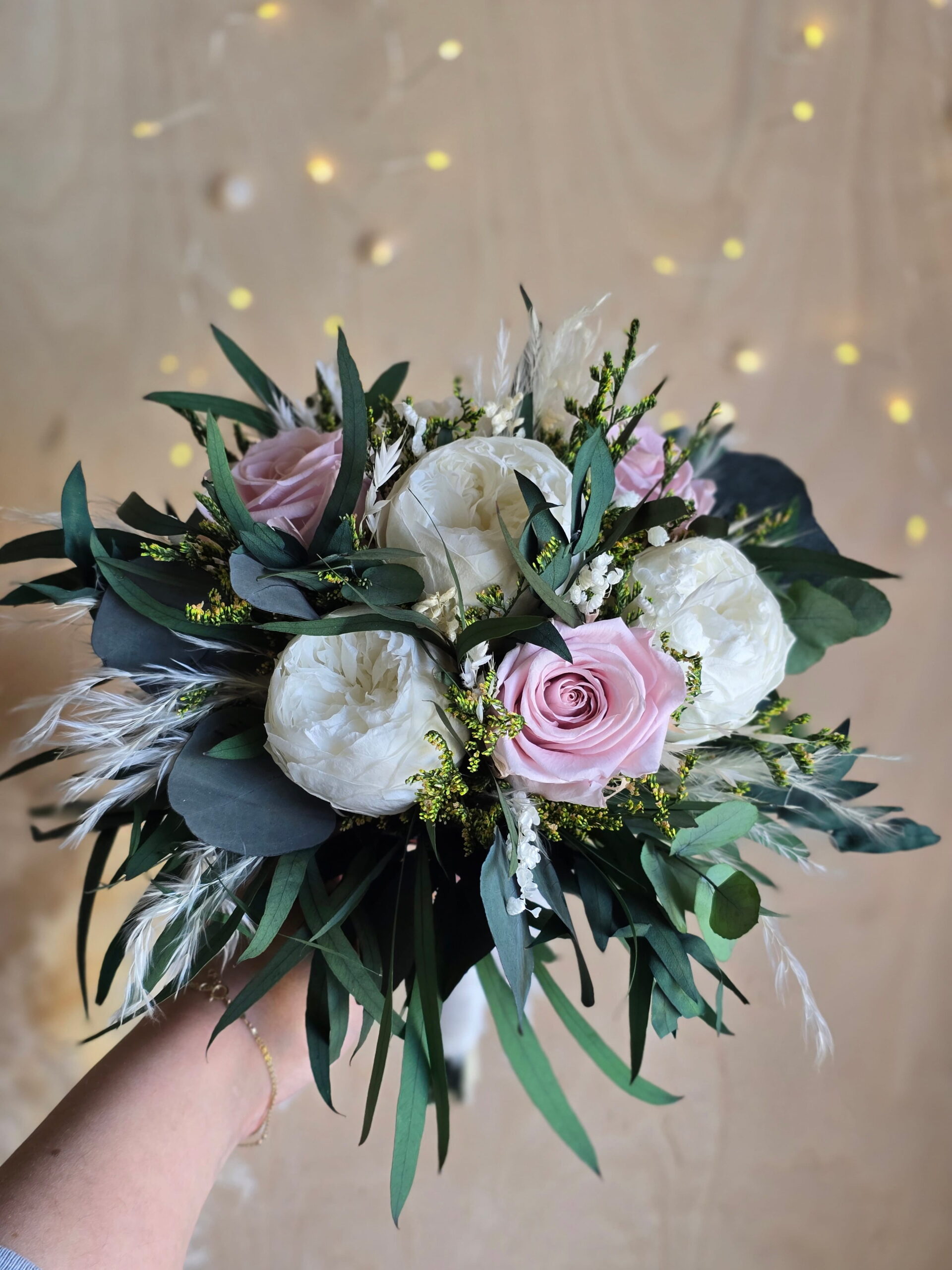 Bukiet wykonany jest głównie ze stabilizowanych kwiatów i roślin. W kompozycji znajdują się róże piwoniowe, róże klasyczne, kilka rodzajów eukaliptusa oraz suszone dodatki, które nadają całości naturalnego charakteru i lekkości.